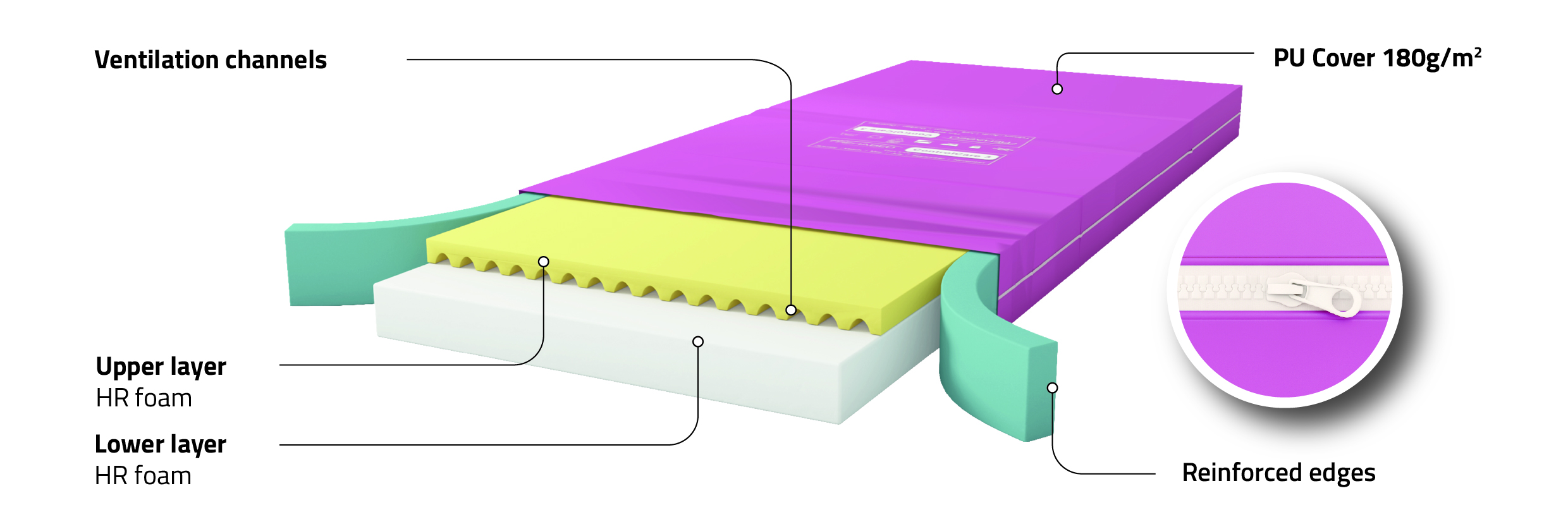 Ventilation channels. A system of longitudinal ventilation channels ensures proper air circulation – a solution of great importance in pressure ulcer prevention.
