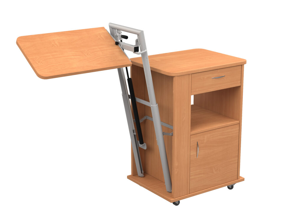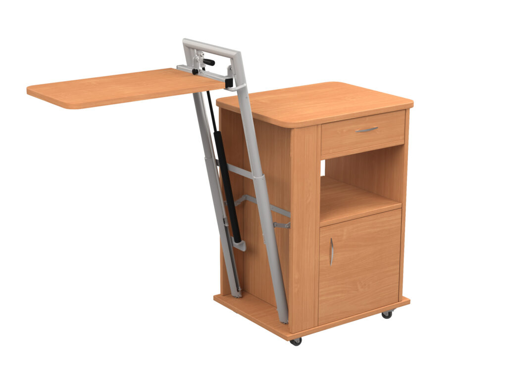 BEDSIDE CABINET WITH HEIGHT-ADJUSTABLE AND TILTING BED TABLE.
